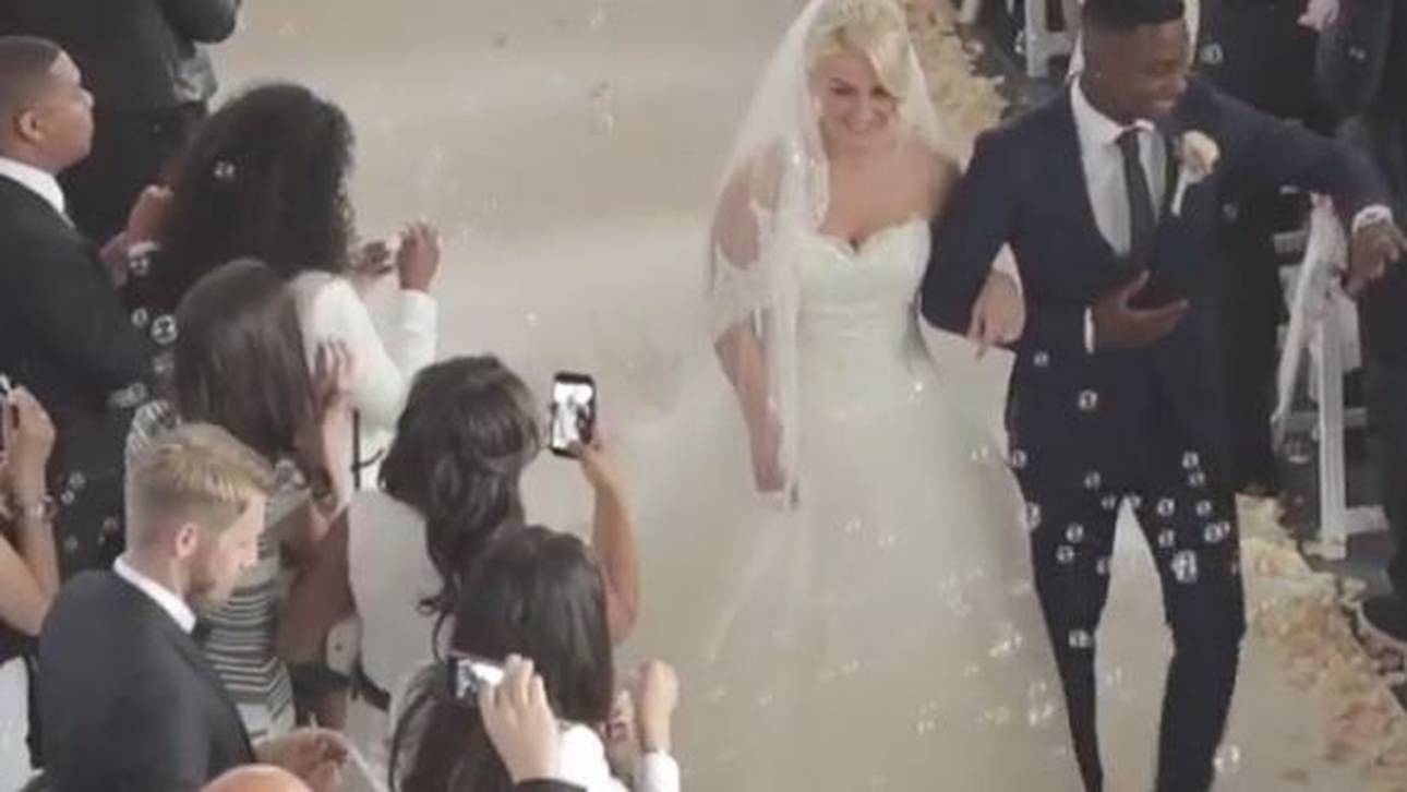 Unter den Gästen erkennt man auch den früheren Bremer Aaron Hunt, der beim Gang des Paares zum Altar wie die anderen Gäste Seifenblasen in die Luft pustet.