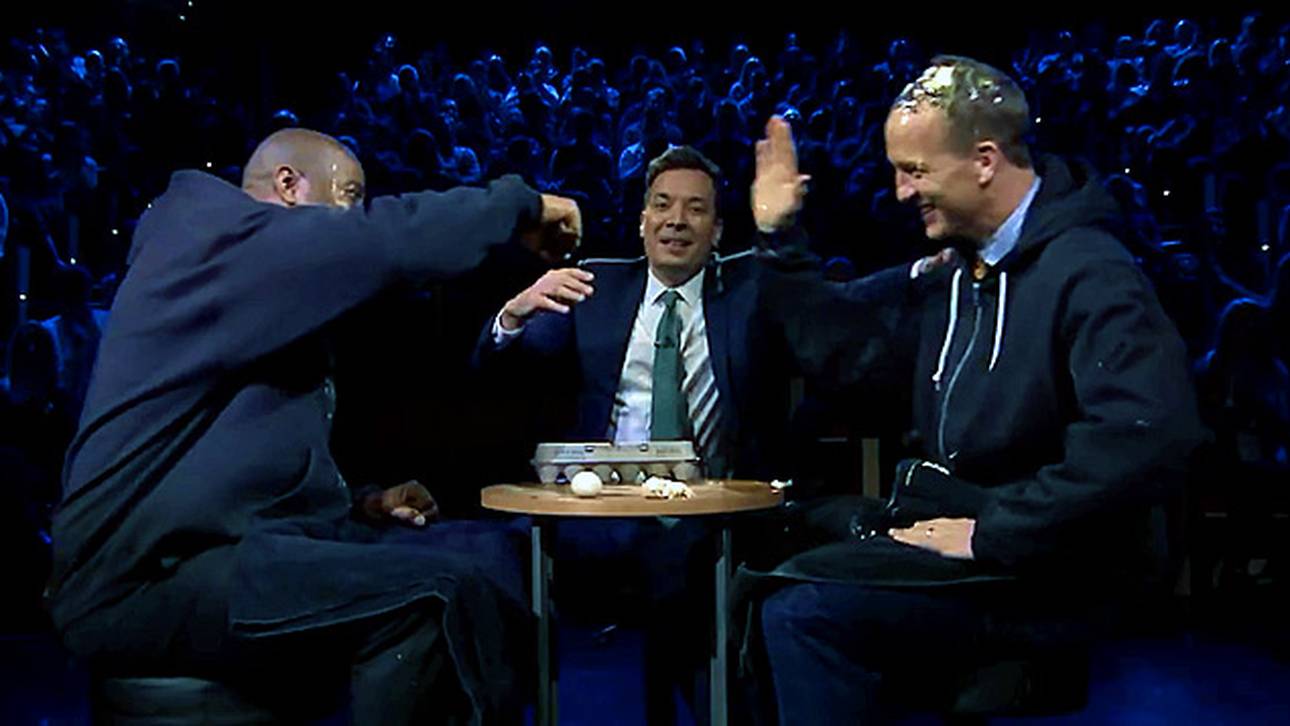 Danach kommen bei mit dem Schrecken davon, ehe Manning das zweite rohe Ei auf seinem Kopf zerschmettert und verliert. Es folgt ein klassischer „Hand-auf-Faust-Handschlag“ der beiden Sportlegenden, die immerhin einen gigantischen Kaputzenpulli zum Schutz ihrer Anzüge anziehen durften.