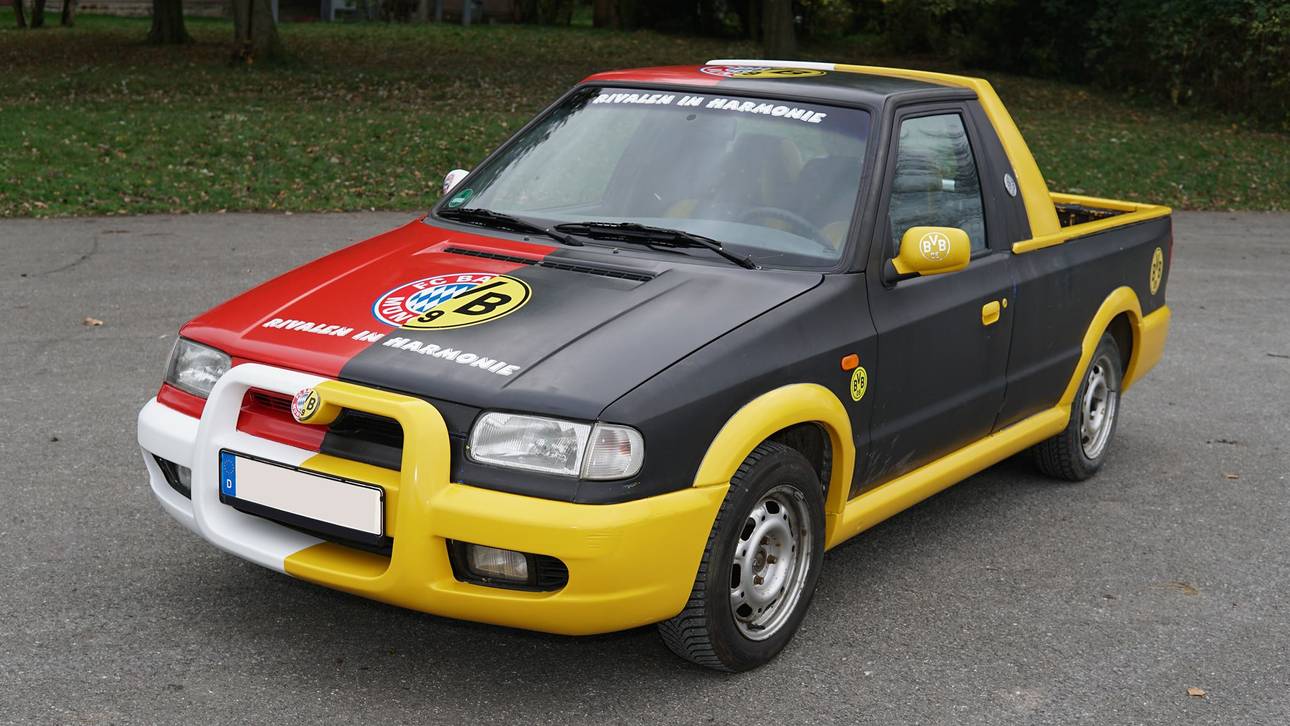Bamfaste bedankte sich auf seine eigene Weise. Da ihm das Auto offenbar schon länger ein Dorn im Auge war, lieh er sich kurzerhand den Pickup vom Chef aus und versah die rechte Seite des Autos in den Farben der Konkurrenz. Inklusive Schriftzug „Rivalen in Harmonie“.