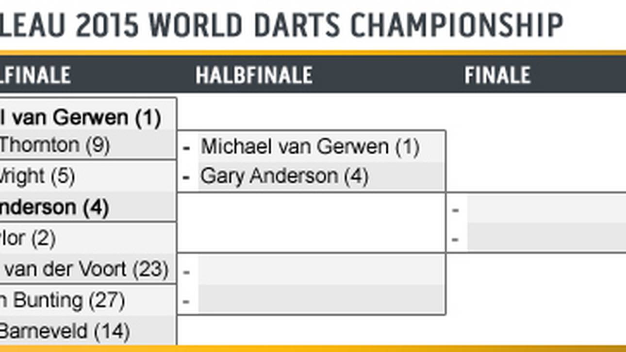 Mit einem krachenden 170er-Königs-Finish zum 5:2 beendete Titelverteidiger Michael van Gerwen bei der Darts-WM (täglich LIVE im TV auf SPORT1 und im LIVESTREAM) das Viertelfinale gegen Robert Thornton. Dort trifft er auf Gary Anderson, der Peter Wright beim 5:1 keine Chance ließ.