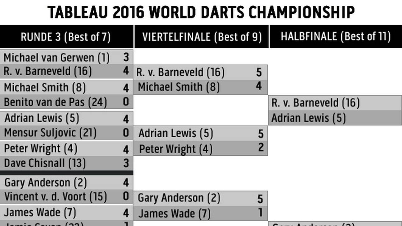 Bei eigener Aufnahme vergab Lewis zunächst drei Matchdarts. Doch Wright verfehlte seinen Setdart haarscharf und Lewis checkte über die Doppel-5 zum Matchgewinn.