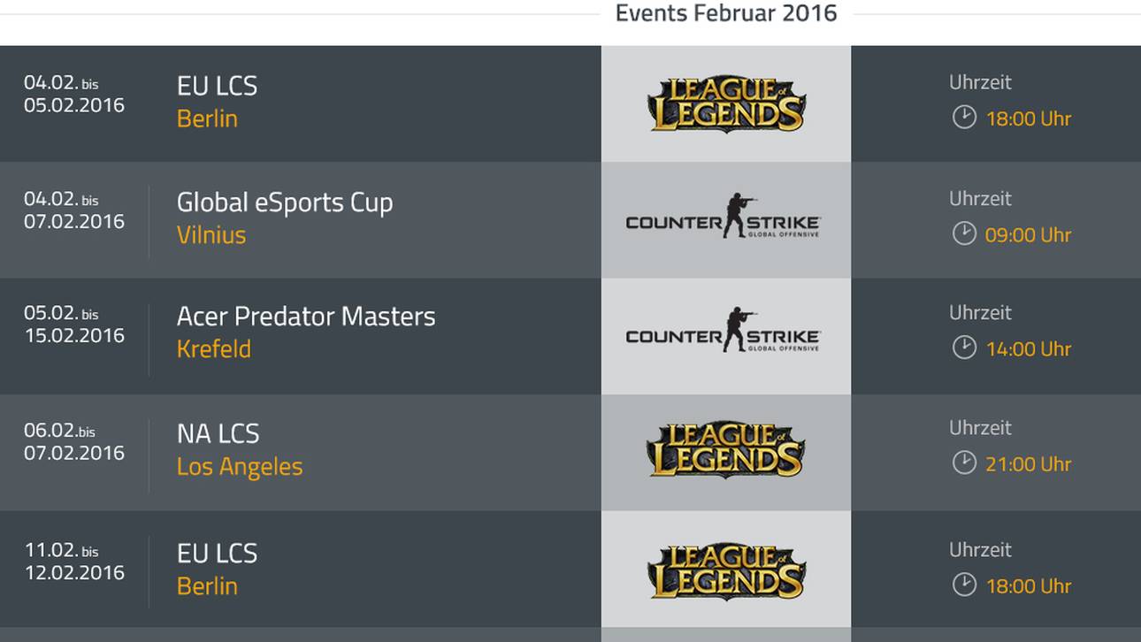 Hier erfahren Sie welche Events in der Welt des eSports, zu welcher Zeit in diesem Monat stattfinden. Dabei stehen die seches großen eSports-Titel im Vordergrund: League of Legends, Counter-Strike:Global Offensive, Dota2, StarCraft II, Heroes of the Storm und Hearthstone.