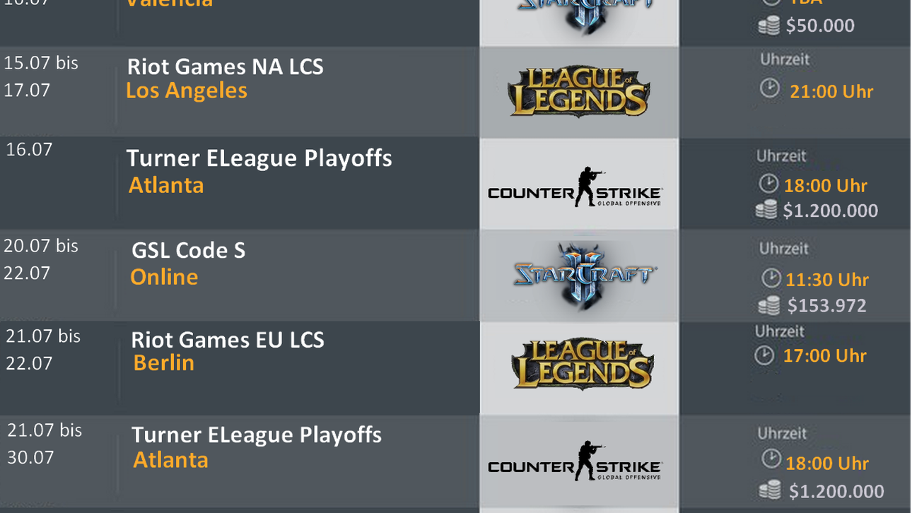 Hier erfahren Sie welche Events in der Welt des eSports, zu welcher Zeit in diesem Monat stattfinden. Dabei stehen die seches großen eSports-Titel im Vordergrund: League of Legends, Counter-Strike:Global Offensive, Dota2, StarCraft II, Heroes of the Storm und Hearthstone.