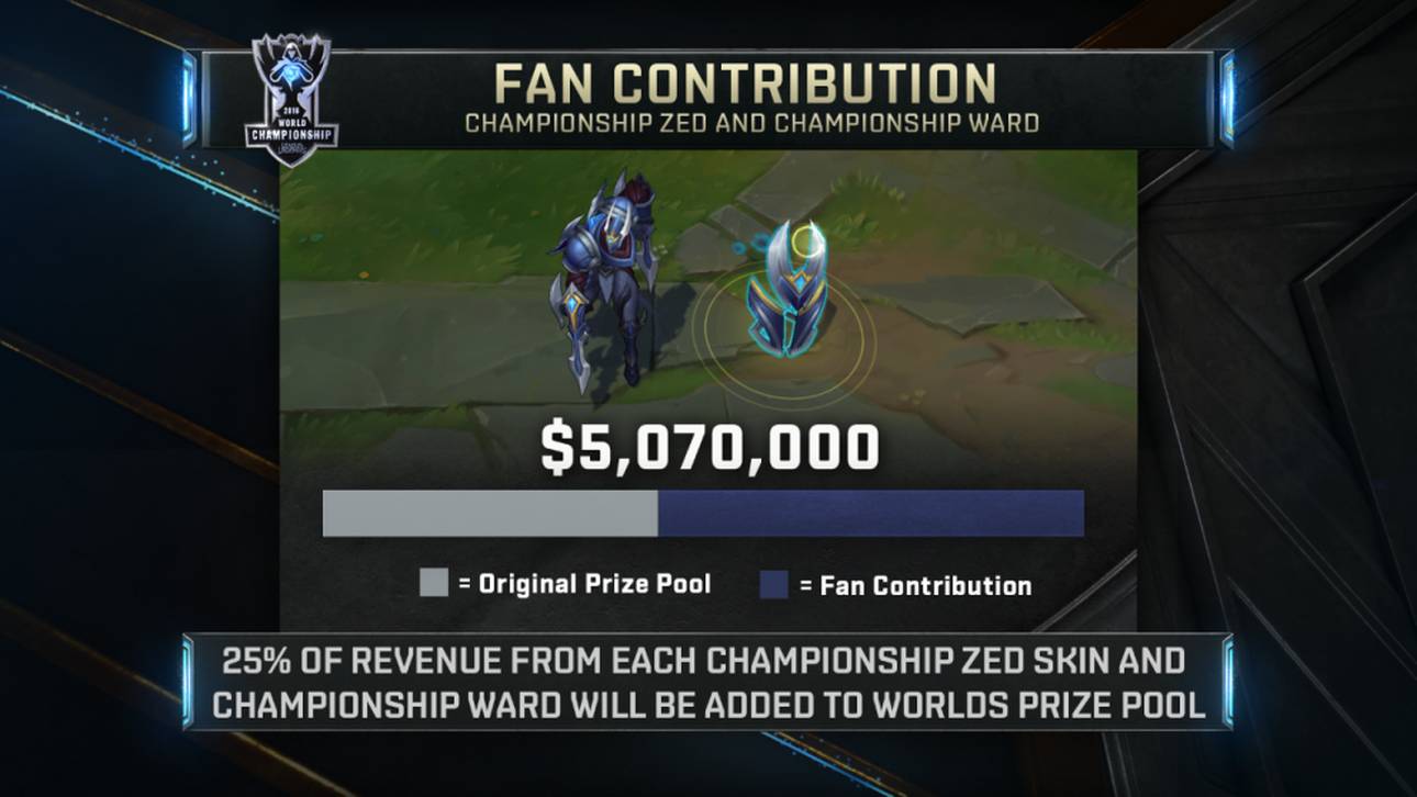 Riot Games orientierte sich ebenfalls an diesem Modell und hoffte die letzten Wochen auf das Engagement der League-Community. Alle Einnahmen, die durch den Verkauf von Zed-Championship und Ward-Championship-Skins erwirtschaftet werden, fließen direkt in das Preisgeld für die Worlds, sowie das Mid Season Invitational. Dabei teilen sich beide Events jeweils 50 Prozent der Einnahmen.