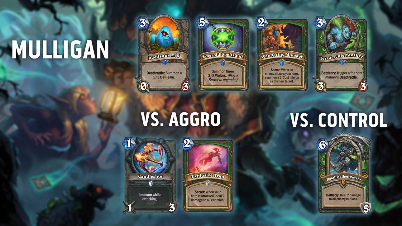 Bereits mehrfach erwähnt und auch auf der Starthand immens wertvoll: das „Devilsaur Egg“. Darüber hinaus lohnt es sich auch den „Spellstone“, „Wandering Monster“ oder „Terrorscale Stalker“ auf die Hand zu nehmen. Doch wie immer gibt es weitere Karten, die sich im Spiel gegen unterschiedliche Decks besser eignen.