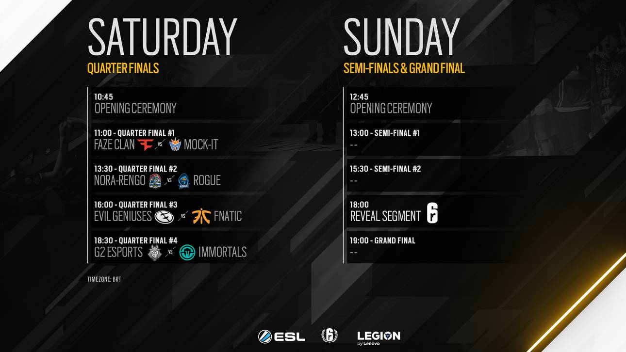 Die besten acht Teams aus vier verschiedenen Regionen spielen vom 17. bis 18. November in der Jeunesse Arena im Olympiapark der brasilianischen Hauptstadt um den WM-Titel und einem Prizepool von 275.000 US-Dollar in Rainbow Six Siege.