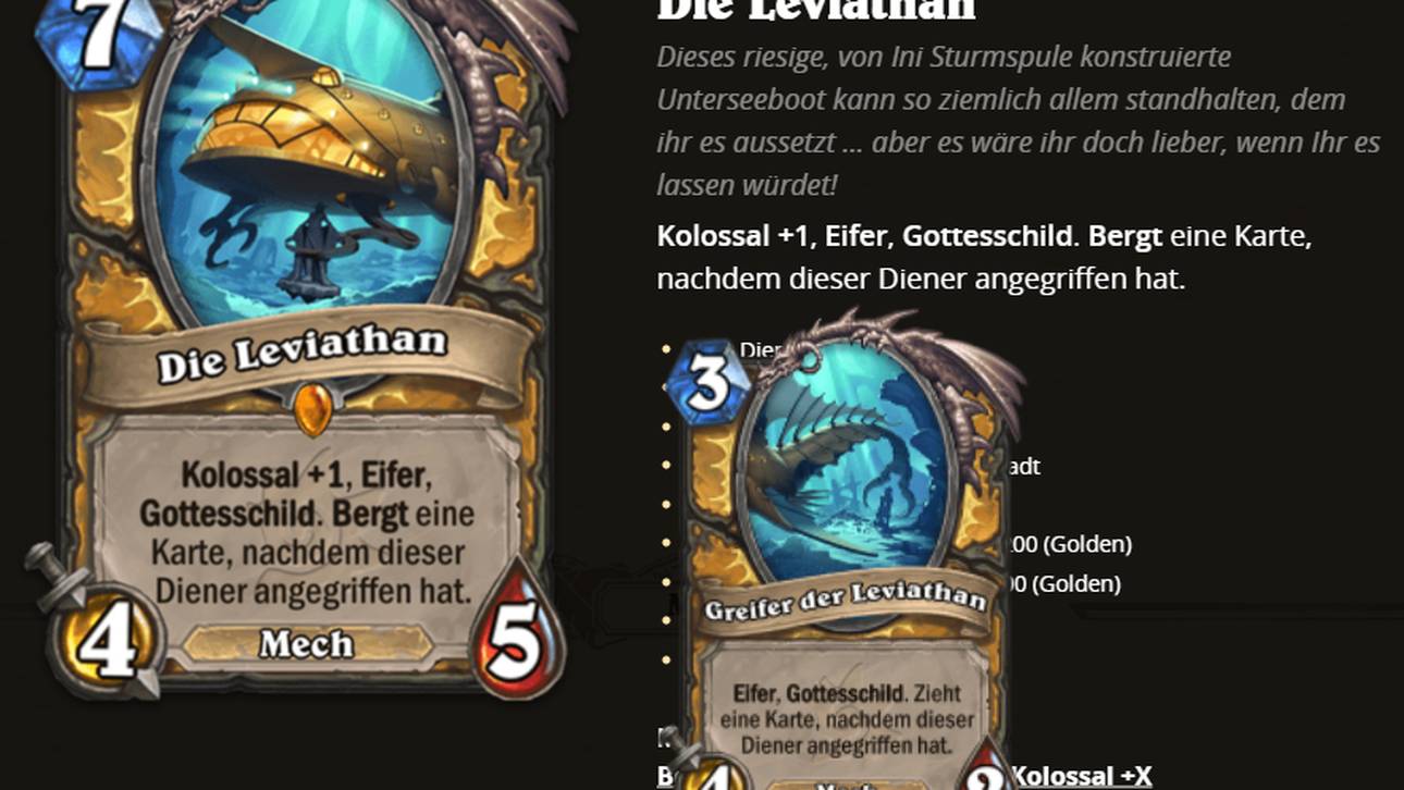 Der Paladin erhält mit der Leviathan den zweiten kolossalen Mech der Expansion gesponsert. Das 7 Mana kostende riesige Unterwassergefährt ist aufgeteilt in zwei Teile: Einem 4|5er Hauptkörper, der sowohl über Eifer als auch Gottesschild verfügt, und einem Greifer, der von den Stats mit 4|2 nicht ganz so beeindruckend daherkommt, aber ebenso wie das eigentliche Vehikel mit den beiden genannten Schlüsselwörtern versehen ist. Doch damit nicht genug.