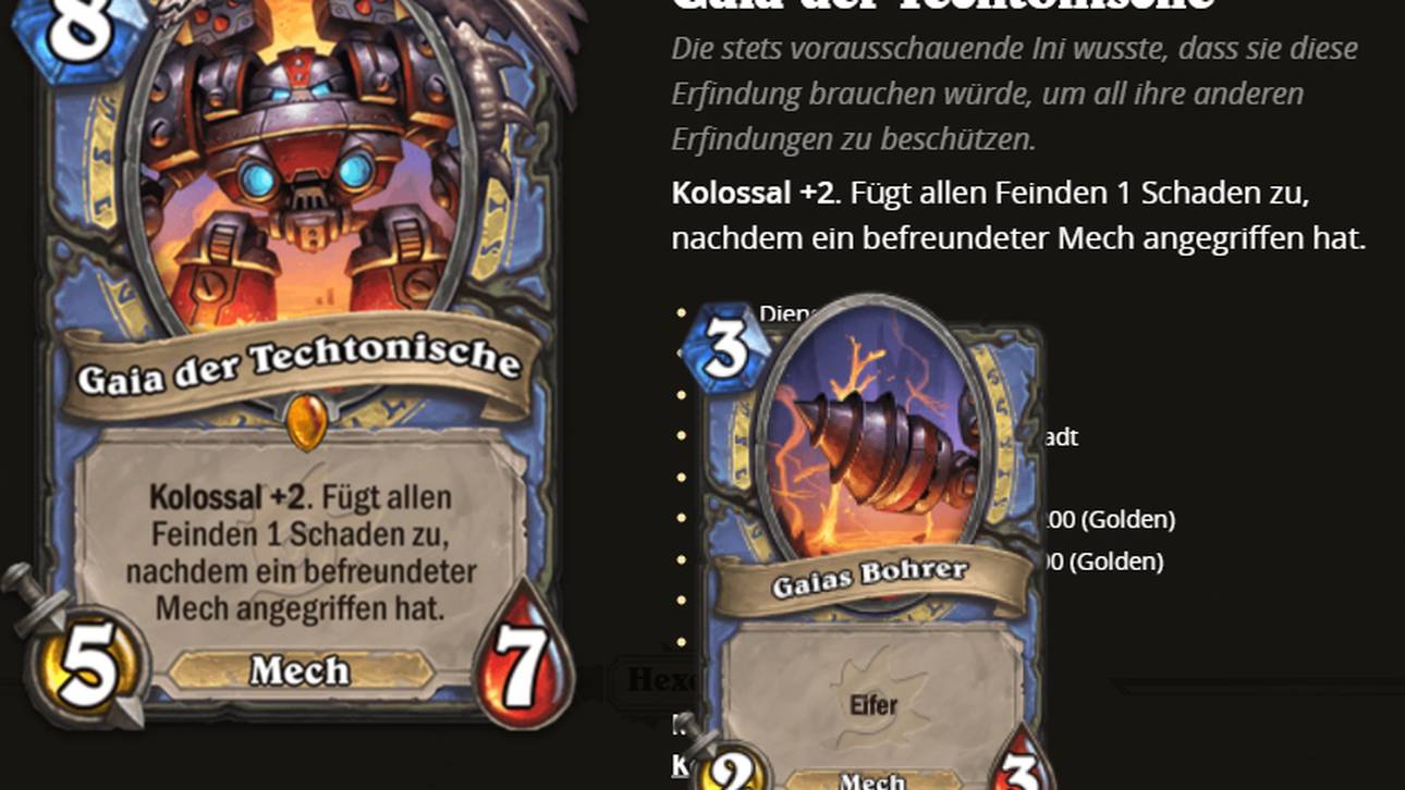Gaia ist ein durchweg solides neues legendäres Minion für den Magier. Ein Koloss, der durch seine beiden Bohrer nicht nur gezielt Feinde vom Brett nehmen kann, sondern zusätzlich dazu noch nebenbei Schaden an den Lebenspunkten des Gegners verursacht. Je mehr selber kontrollierte Mechs zum Zeitpunkt der Beschwörung Gaias auf dem Feld sind, desto besser.