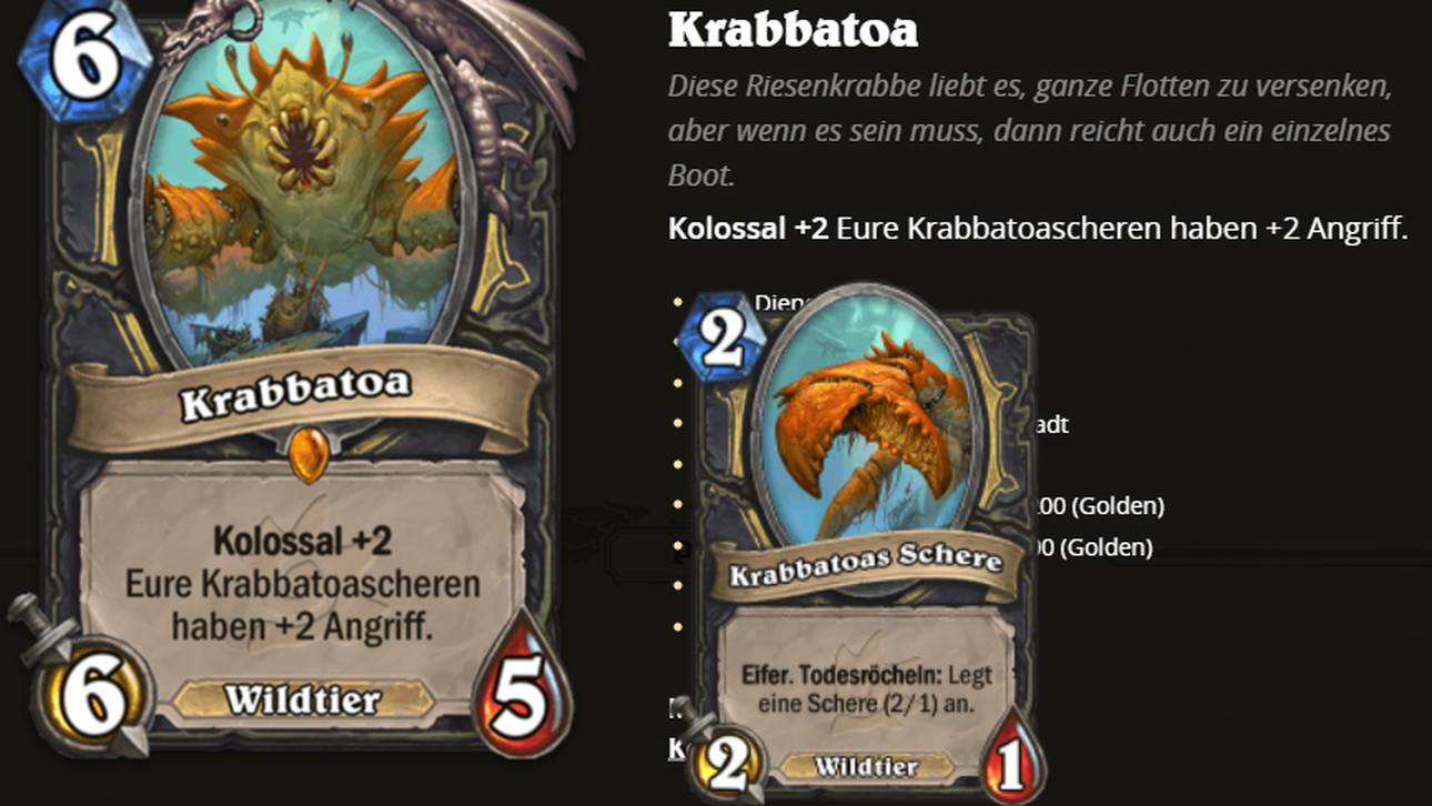 Eine flottenfressende Krabbe kolossalen Ausmaßes für 6 Mana bei 6|5er-Stats. Zusätzlich zu dem durchaus soliden Hauptkörper verfügt Krabbatoa über zwei weitere Gliedmaßen in Form zweier 2|1er-Scheren die jeweils mit dem Schlüsselwort Eifer versehen sind. Hinzu kommt jeweils der Todesröcheln-Effekt, bei dem der Schurke beim Ableben der Gliedmaßen eine 2|1er „Krabbatoascheren-Waffe“ anlegt. Diese Waffen haben – solange der Hauptkörper Krabbatoas auf dem Feld ist – zusätzlich noch einmal +2 Angriff.