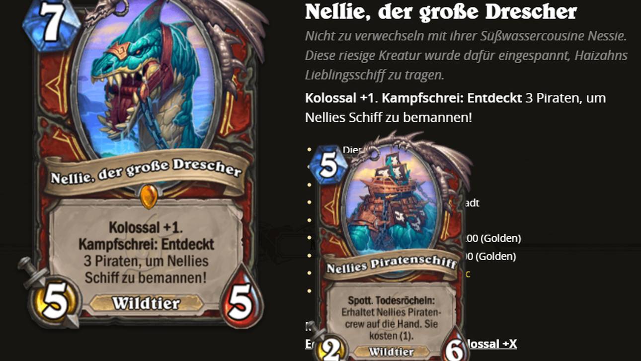 Nellie, der große Drescher ist ein 7 Mana kostendes 5|5er-Wildtier, das gleichzeitig als Piraten-Transportmittel dient. Beim Ausspielen des Ungeheuers entdeckt der Spieler drei Piraten, um Nellies Piratenschiff – ein mit Spott versehenes 2|6er-Minion – zu bemannen. Wird das Freibeuter-Gefährt versenkt, erhält der Spieler die zuvor entdeckten Piraten auf die Hand. Alle drei kosten danach nur 1 Mana.