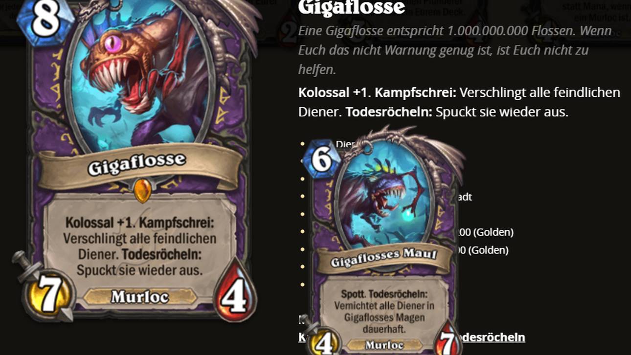 Wildtiere, Dämonen, Mechs – Alles Dienerarten, unter denen sich jeder Hearthstone-Fan ohne viel Fantasie einen Koloss vorstellen kann. Mit Gigaflosse kommt nun ein riesenhafter Vertreter des Volks der Murlocs hinzu, welches eher für ihre schiere Anzahl, als ihre überwältigende Kraft und Stärke bekannt war. Und auch wenn es mit Narbenflosse und Mutanus dem Verschlinger gewisse Ausnahmen gibt, befindet sich Gigaflosse noch einmal in einer ganz eigenen Liga.