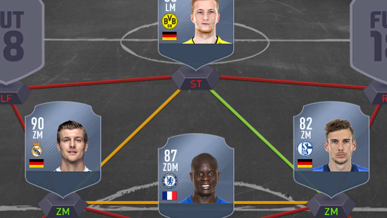 Zwei Übereinstimmungen reichen für den Maximalwert. Marco Reus und Leon Goretzka zum Beispiel hätten trotz der Rivalität ihrer Vereine eine grüne Verbindung. Zu Toni Kroos, der in einer anderen Liga spielt, hätte Reus nur eine orangene Linie. Ultimate Team-Spieler sollten immer darauf achten, dass alle Fußballprofis um sich herum orangene oder grüne Verbindungen haben und so auf eine Spielerchemie von 9 kommen. Das geht nur, wenn die Spieler auf der richtigen Position aufgestellt sind.