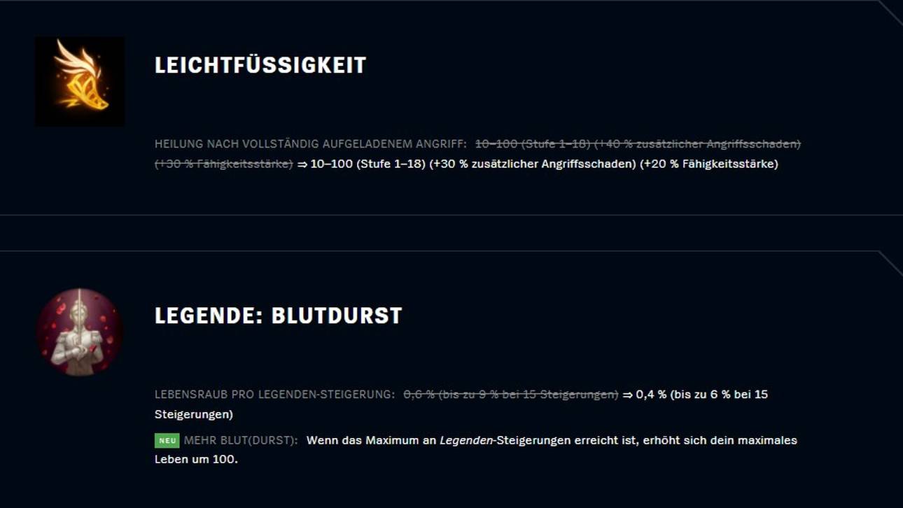 Außerdem wurde „Leichtfüßigkeit“ (Fleet Footwork) und „Legende: Blutdurst“ (Legend: Bloodline) abgeschwächt und im Fall von Legende: Blutdurst auch leicht abgeändert.