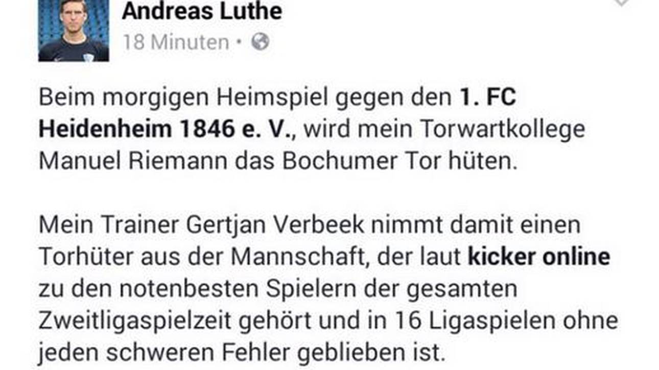 „Beim morgigen Heimspiel gegen 1. FC Heidenheim 1846 e.V., wird mein Torwartkollege Manuel Riemann das Bochumer Tor hüten“, schrieb Luthe und äußerte sein Unverständnis.