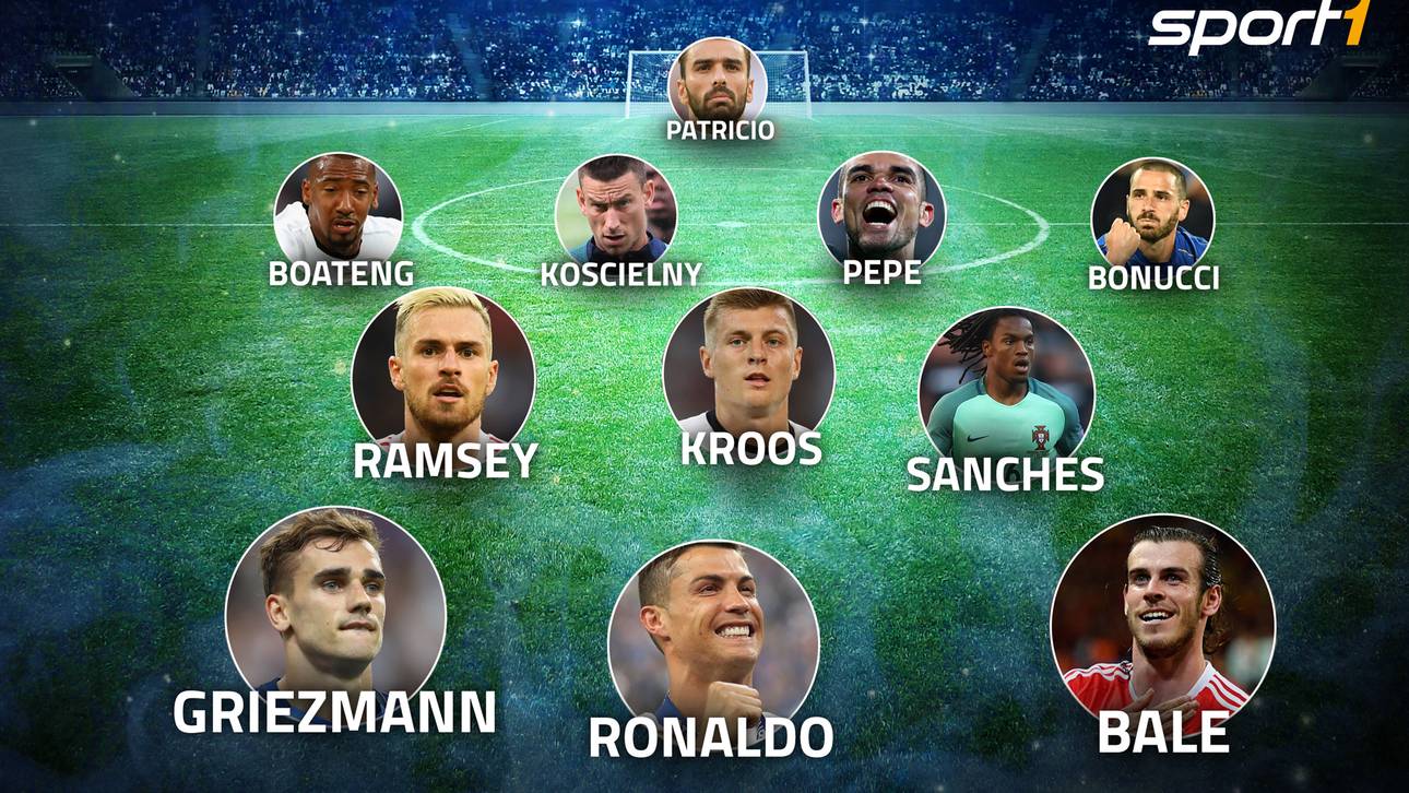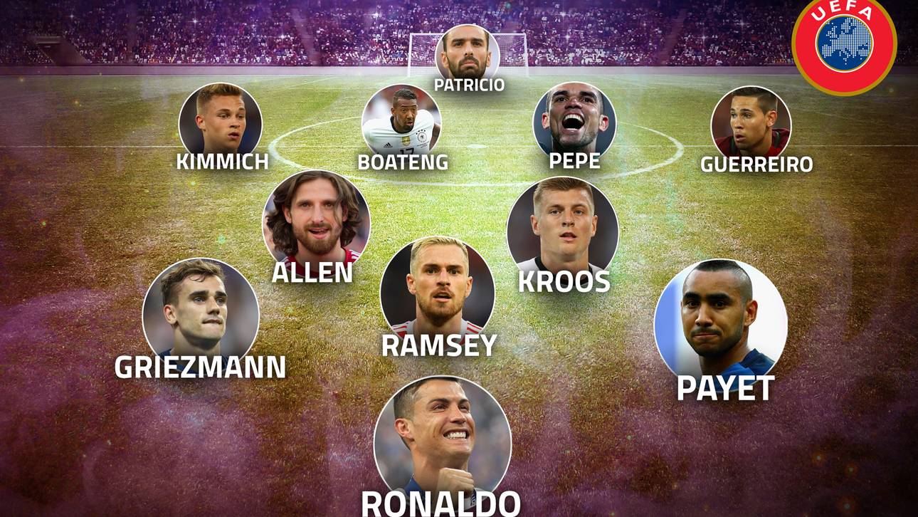 In Cristiano Ronaldo, Pepe und dem Neu-Dortmunder Raphael Guerreiro sowie Torwart Rui Patricio stehen vier Europameister aus Portugal im UEFA-Team, zudem die beiden Franzosen Antoine Griezmann und Dimitri Payet sowie die beiden Waliser Aaron Ramsey und Joe Allen. (Voting: Wer war der beste Spieler der EM?)