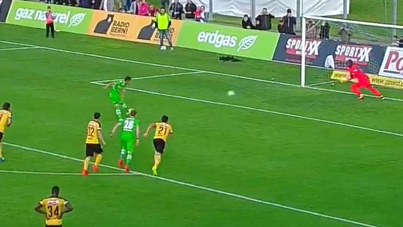 Stobl platziert die Kugel ins linke Eck, Berns Keeper kommt nicht mehr heran.