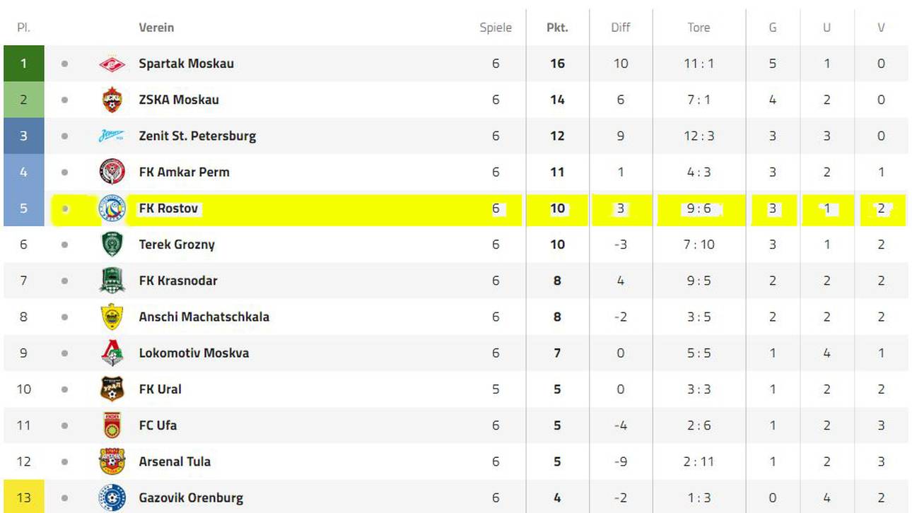 Der Überraschungszweite der vergangenen Saison in der russischen Premier Liga hinkt der Tabellenspitze in der neuen Spielzeit schon etwas hinterher: Nach sechs Spieltagen rangiert Rostov bereits sechs Punkte hinter Tabellenführer Spartak Moskau. Zuletzt gab es am Freitag ein mühsames 2:1 gegen Schlusslicht Krylja Sowjetow Samara.