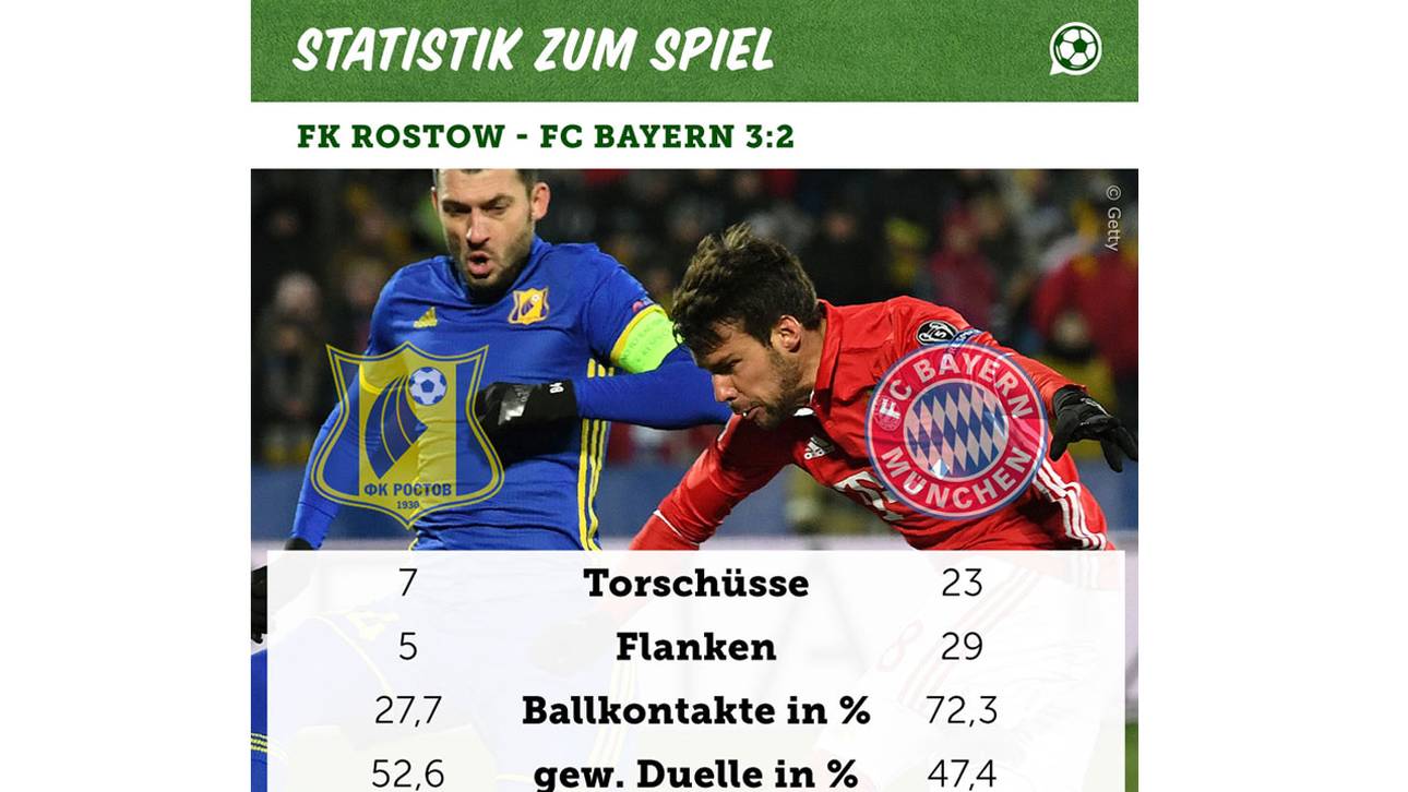 Am vergangenen Samstag hatten die Münchner, die das Hinspiel gegen Rostov noch mit 5:0 gewonnen hatten, bei Borussia Dortmund verloren (0:1). Am kommenden Samstag empfangen die in der Bundesliga von Aufsteiger RB Leipzig überholten Bayern zu einem weiteren Spitzenspiel Bayer Leverkusen.