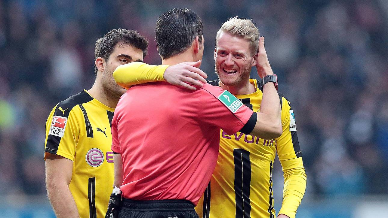 Schiedsrichter Wolfgang Stark und die Spieler von Borussia Dortmund sind sich am Samstag mehrfach in die Quere gekommen – vor allem in der hektischen Schlussphase wurde es brenzlig.