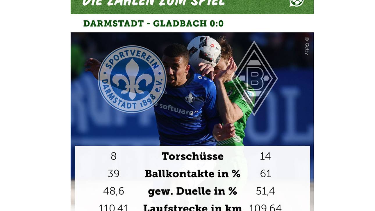 Dennoch beherrschten sie das Geschehen nun deutlich und hatten schließlich durch einen Pfostenschuss von Thorgan Hazard (66.) auch die bis dato beste Möglichkeit des Spiels. Darmstadt hingegen blieb viel zu passiv und bis auf einen Kopfball von Kapitän Aytac Sulu (76.) offensiv ungefährlich.
