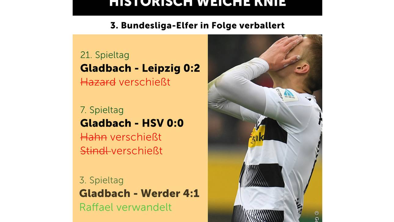 Mit dem Fehlschuss von Thorgan Hazard gegen RB Leipzig – gegen den HSV verschossen zuvor Andre Hahn und Lars Stindl – ist nun eine neue „Rekord“marke erreicht.