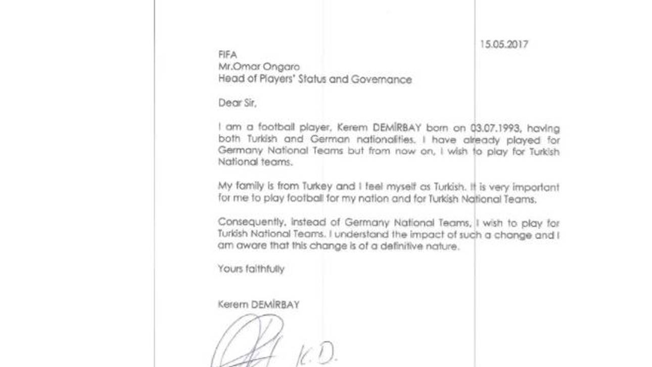 In dem von Demirbay signierten Schreiben, das sowohl in Englisch und Türkisch auf der Verbandswebseite veröffentlicht wurde, hieß es: „Meine Familie kommt aus der Türkei, und ich fühle mich türkisch. Deshalb will ich statt für die deutsche künftig für die türkische Nationalmannschaft spielen. Ich verstehe die Konsequenzen dieses Wechsels und weiß, dass er endgültig ist.“