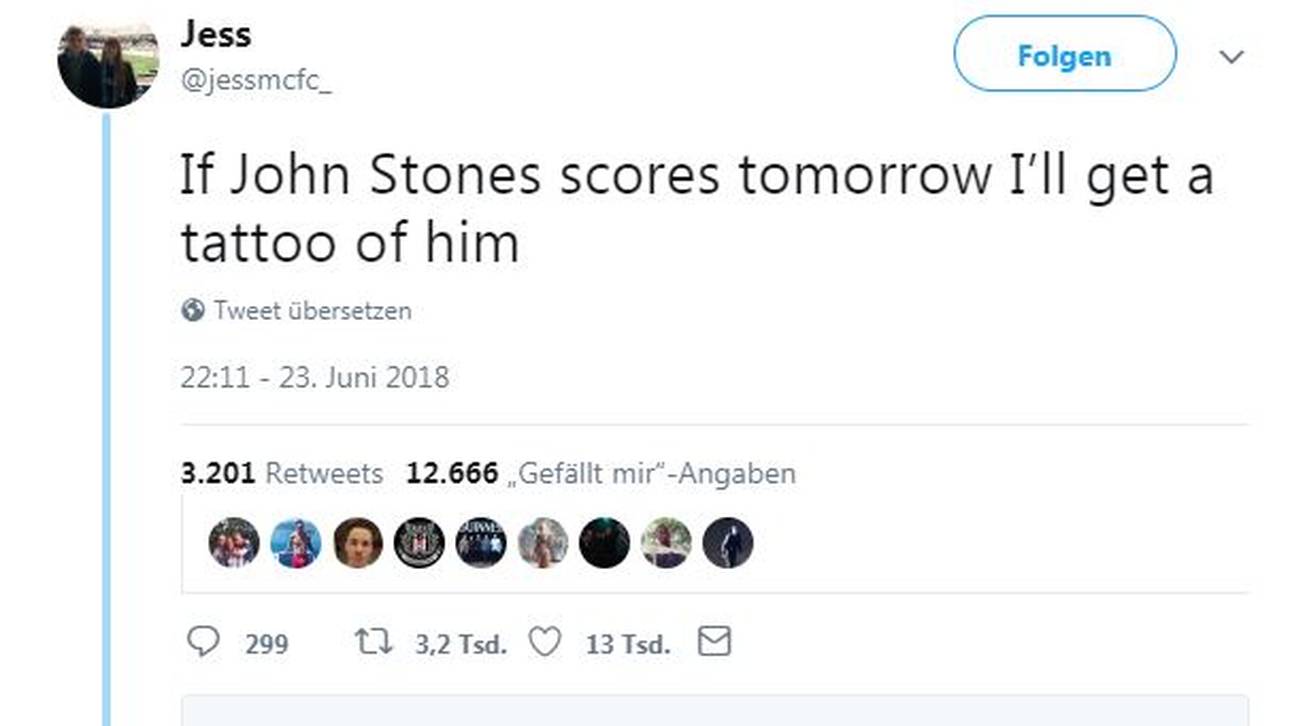 Am Samstag, einen Tag vor dem Torfestival gegen den WM-Neuling, bot der Anhänger via Twitter eine sehr gewagte Wette an. „Wenn John Stones morgen trifft, werde ich mir ein Tattoo von ihm stechen lassen“, so die Botschaft.