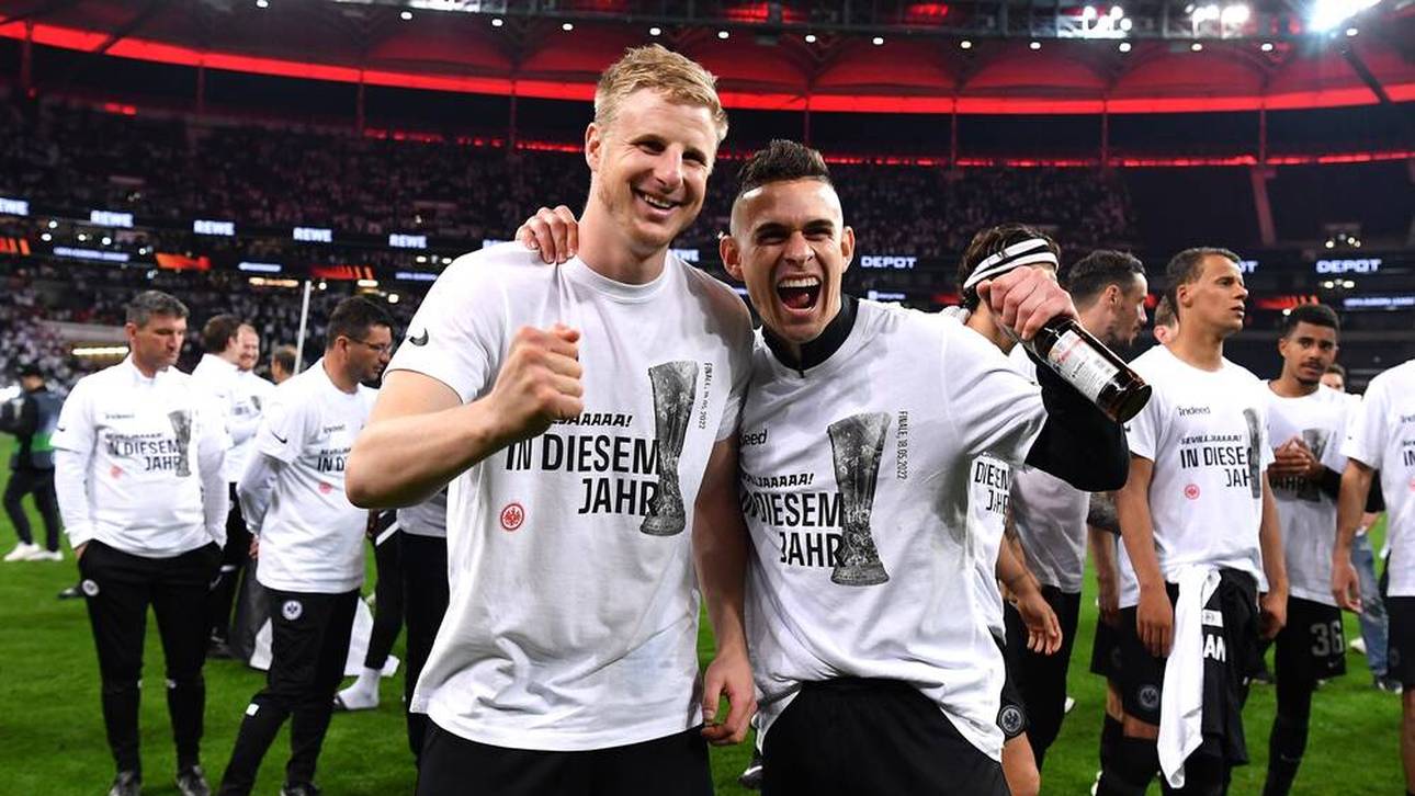 Diese Jubelszenen erinnerten an große Titelfeiern. Dabei ist Eintracht Frankfurt trotz des 1:0-Erfolgs gegen West Ham im Halbfinal-Rückspiel noch einen Schritt vom Titel in der Europa League entfernt – 42 Jahre nach dem Triumph im UEFA-Pokal.