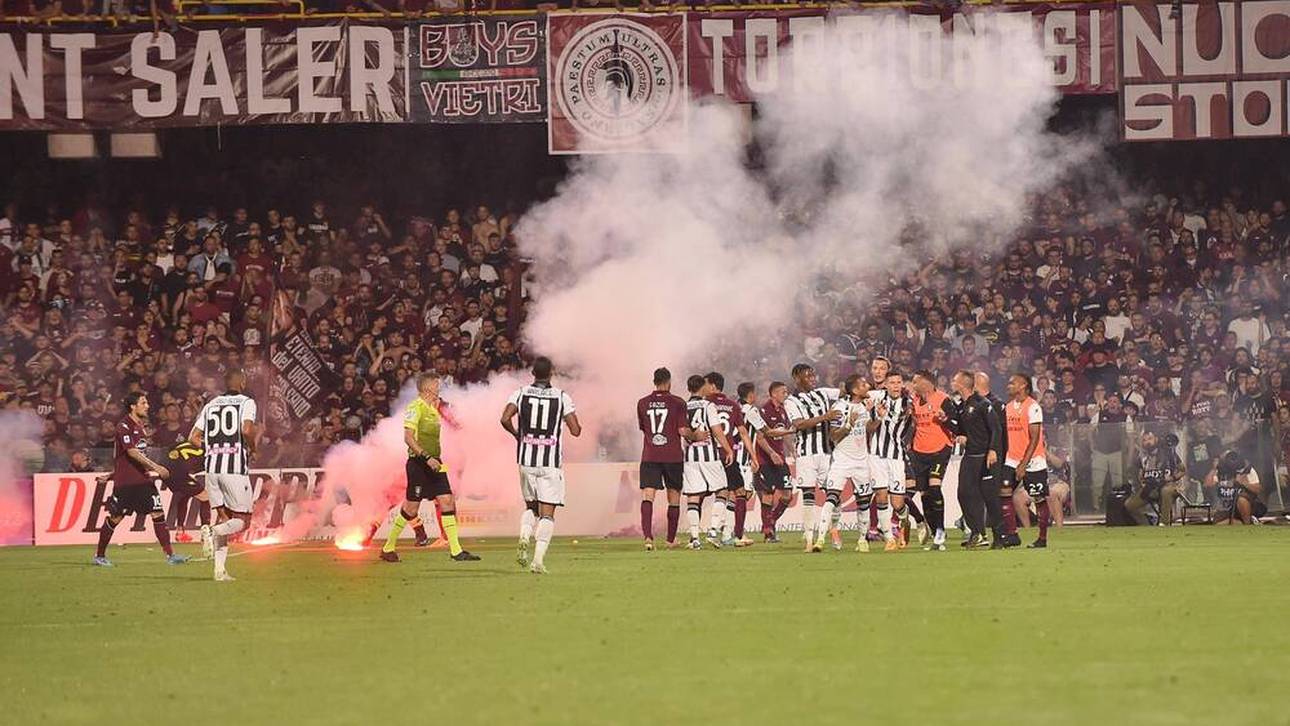 Die Salernitana-Fankurve fasste das als Provokation auf und warf so ziemlich alles auf das Feld, was sie finden konnten: Rauchbomben und andere Gegenstände prasselten auf die Spieler ein.