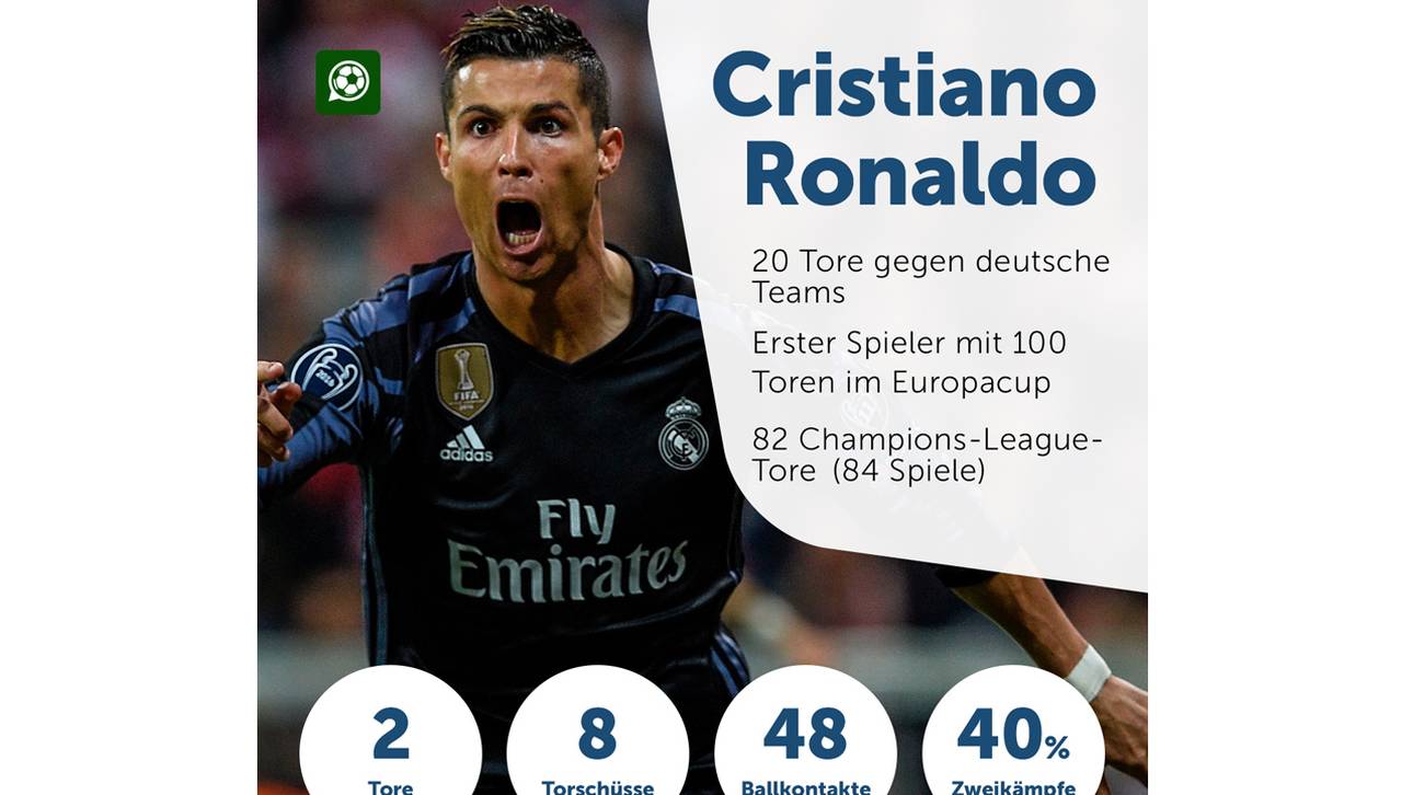 Der auf der Blumeninsel Madeira in Portugal geborene 32-Jährige hat sich bereits fünfmal die Torjägerkrone in der Königsklasse gesichert (2007/08, 2012/13, 2013/14, 2014/15, 2015/16) und hält neben Dauerrivale Lionel Messi vom FC Barcelona den Rekord. Der Argentinier steht bei 97 Europapokal-Toren, davon 94 in der Champions League.