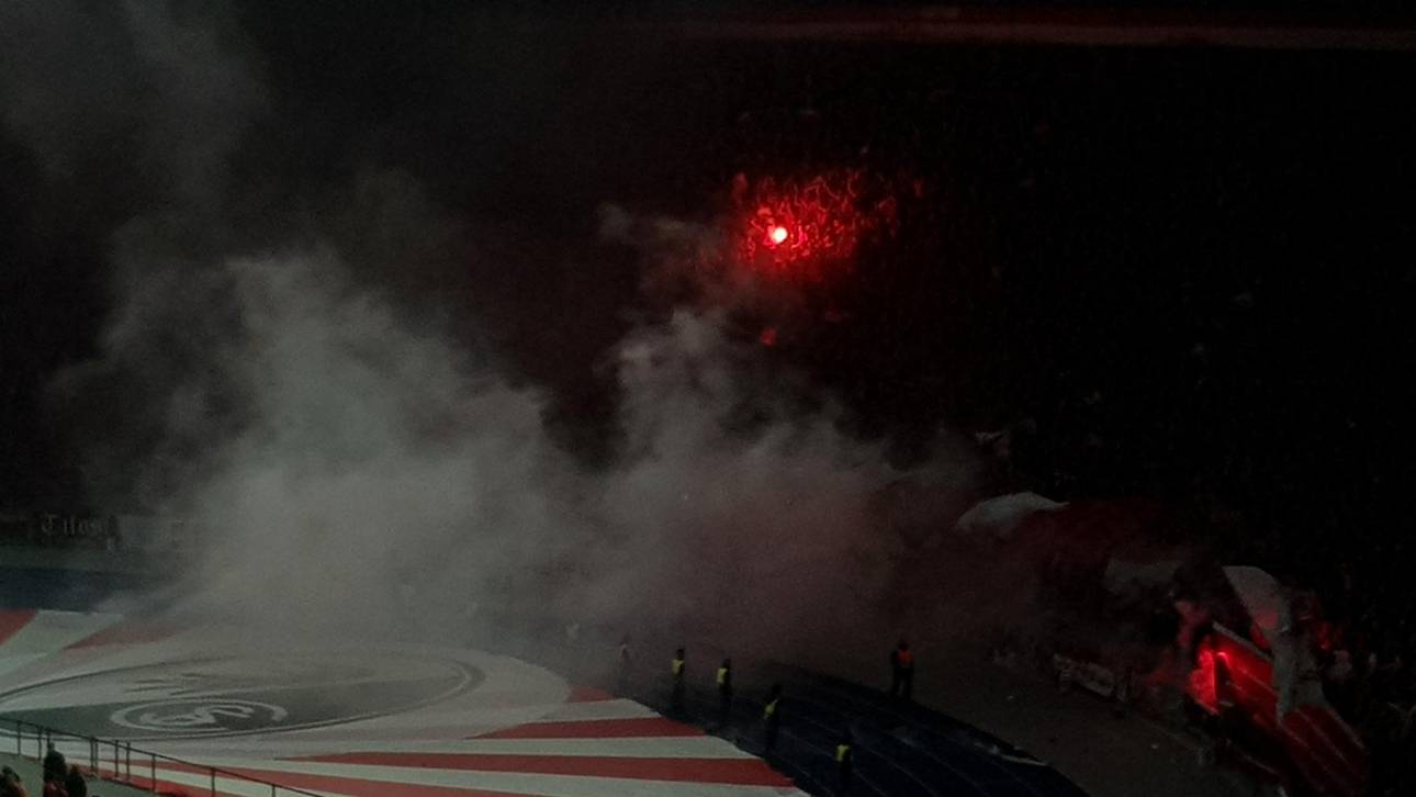 Nach knapp 15 Minuten – beim Stand von 0:0 – begannen sie auf der Ostkurve die Feuerwerkskörper zu entfachen, über der Ostkurve bildeten sich Rauchschwaden.