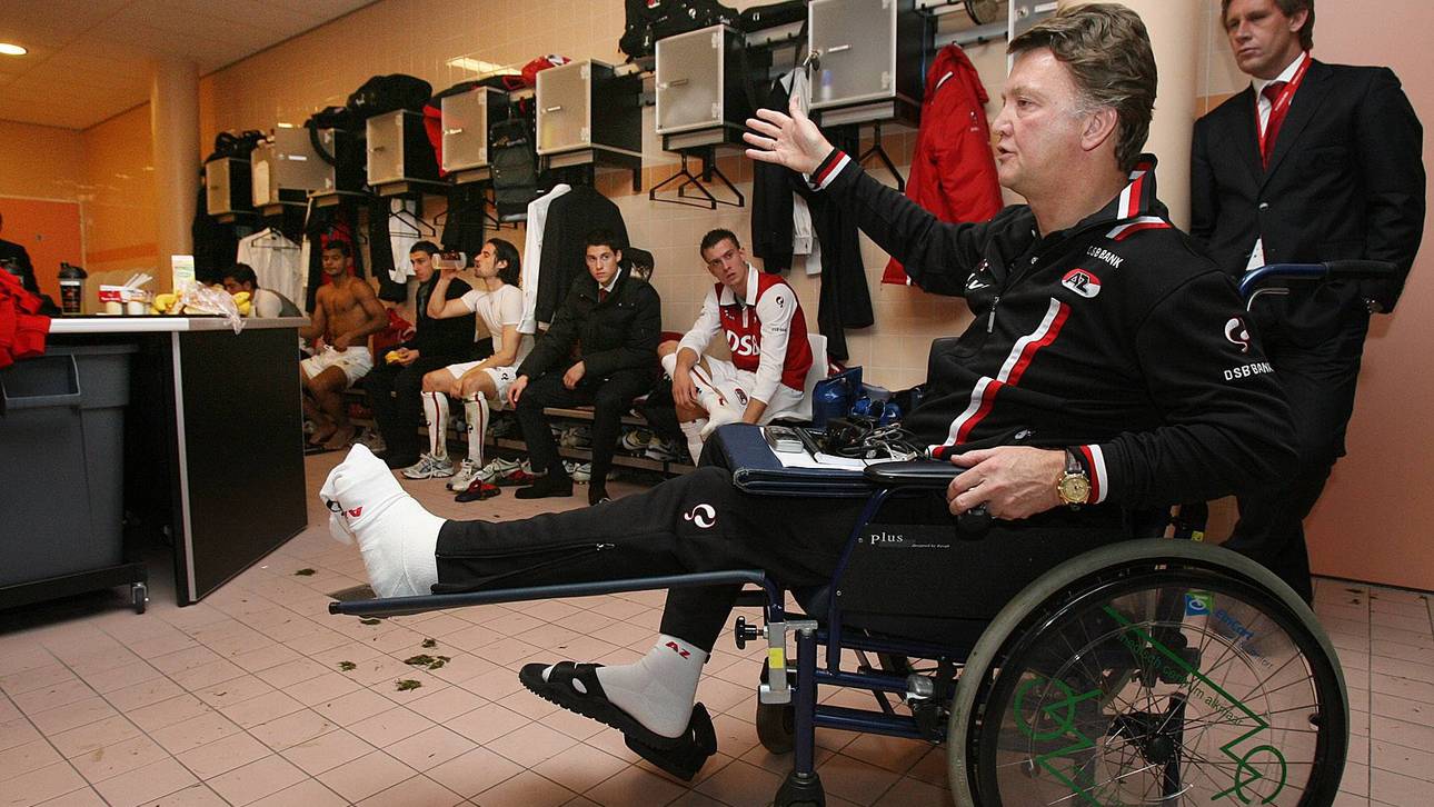 Für den Trainer ist es ein unangenehmes Déja vu. 2007 hatte sich der damalige Trainer von AZ Alkmaar Wadenbein und Knöchel gebrochen, als er bei einem Ehemaligentreffen von Sportlehrern beim launigen Stabhochsprung unglücklich landete. Die nächste Begegnung von AZ sah van Gaal aus dem Rollstuhl heraus.