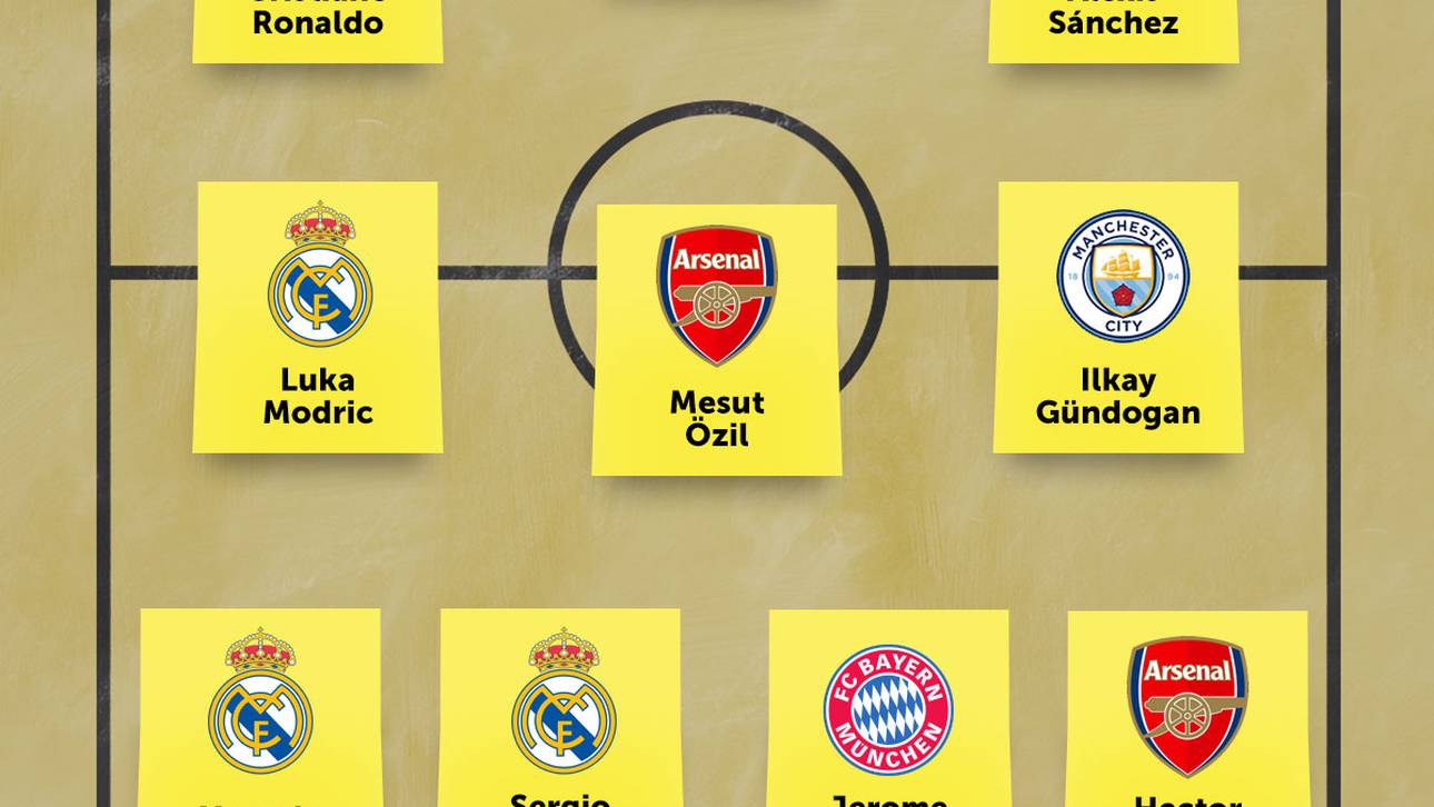 Umgeben ist er in seiner Traumelf von den Real-Stars Cristiano Ronaldo („Er ist eine Maschine, trifft eigentlich immer“) und Luka Modric, seinem DFB-Kollegen Ilkay Gündogan (Manchester City) und Arsenals Alexis Sanchez.