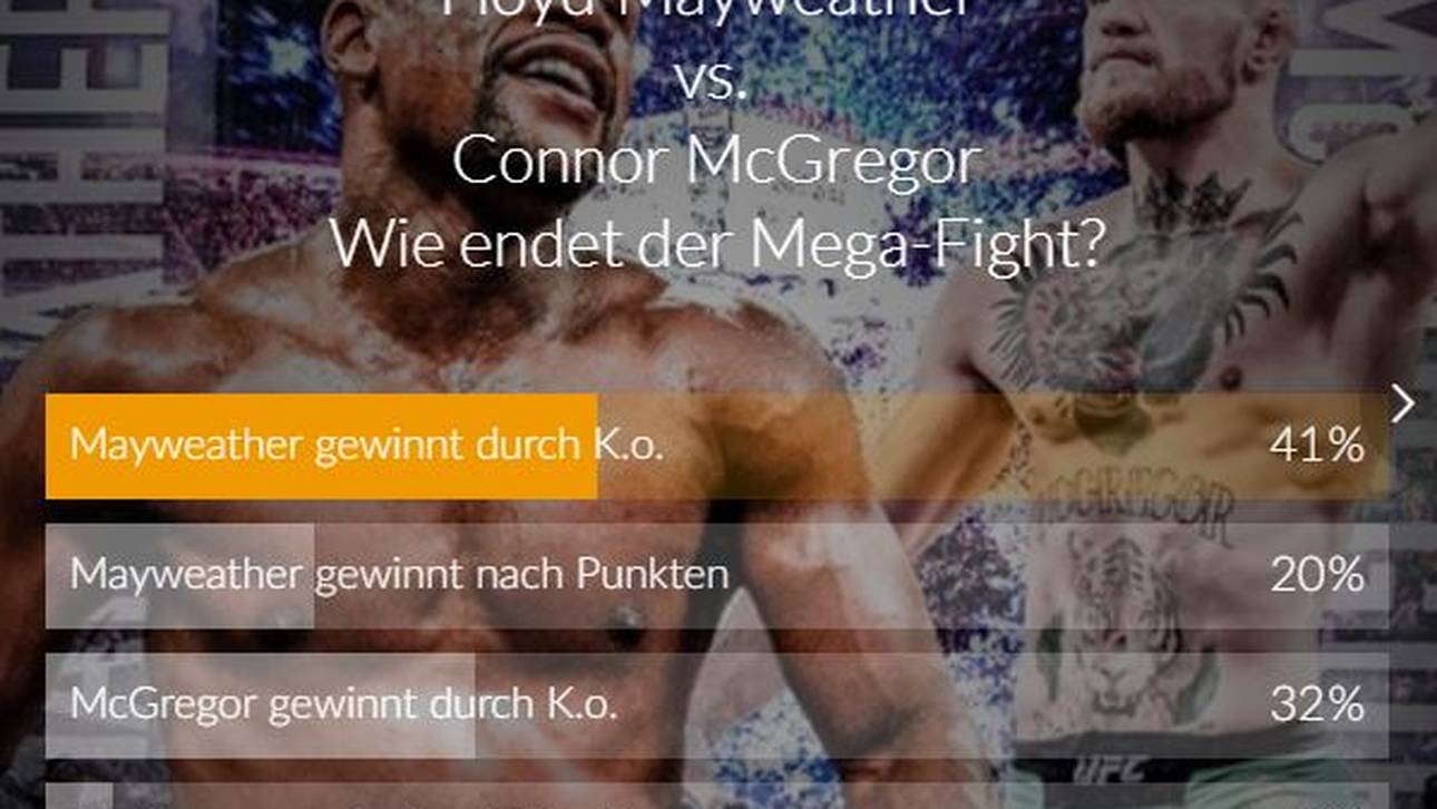 Insgesamt stimmten 42.300 User ab, 61 Prozent davon glauben an einen Sieg von Mayweather, 37 Prozent an einen Triumph von McGregor.