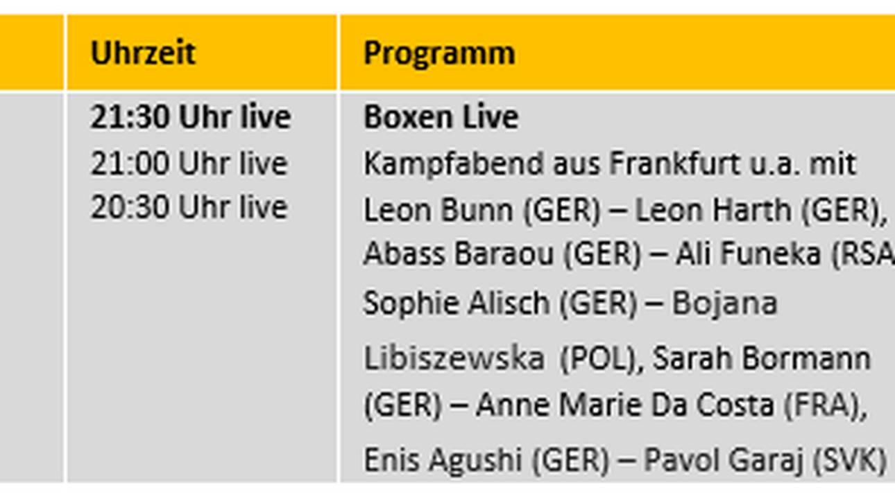 SPORT1 zeigt die Kampfnacht aus der Fraport Arena ab 21.30 Uhr LIVE im TV, ab 21 Uhr im Stream auf SPORT1.de und in der SPORT1 App sowie ab 20.20 Uhr auch auf der Facebook-Seite SPORT1 Boxen. Am Mikrofon begleiten vor Ort Moderatorin Sarah Valentina, Kommentator Tobias Drews und Expertin Regina Halmich das Geschehen, dazu ist der ehemalige Cruisergewichts-Champion Markus Bott zu Gast.