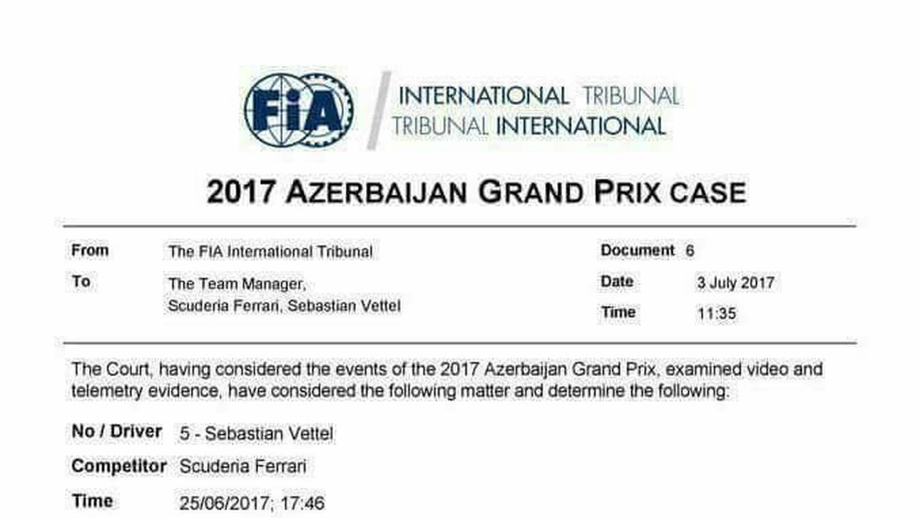 Außerdem war ein entsprechendes, angebliches offizielles Dokument der FIA kursiert, welches scheinbar bestätigte, dass Vettel nachträglich vom Baku-GP disqualifiziert worden sei – dies war jedoch ein Fake.
