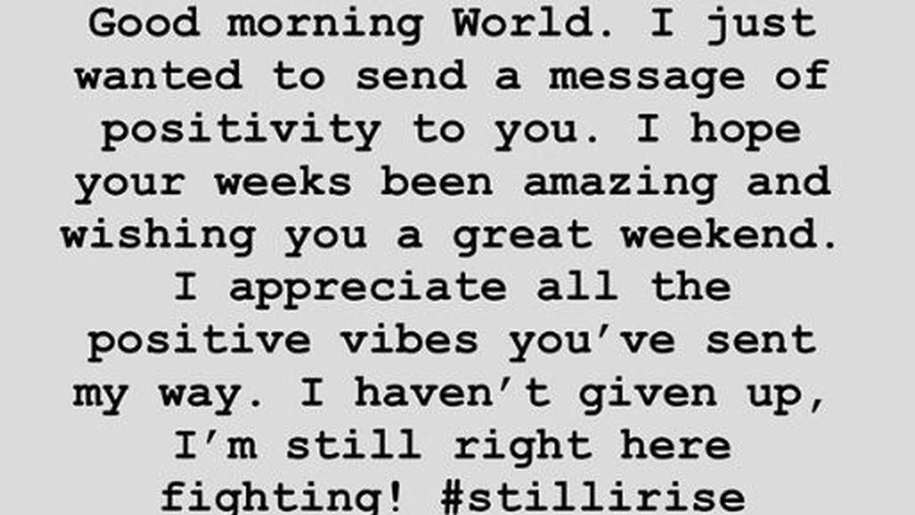 „Guten Morgen Welt. Ich möchte eine positive Message an euch richten. Ich hoffe, ihr hattet schöne Wochen und ich wünsche euch ein wunderschönes Wochenende. Ich schätze eure positive Stimmung, die ihr mir geschickt habt. Ich habe noch nicht aufgegeben, ich bin immer noch hier und kämpfe.“