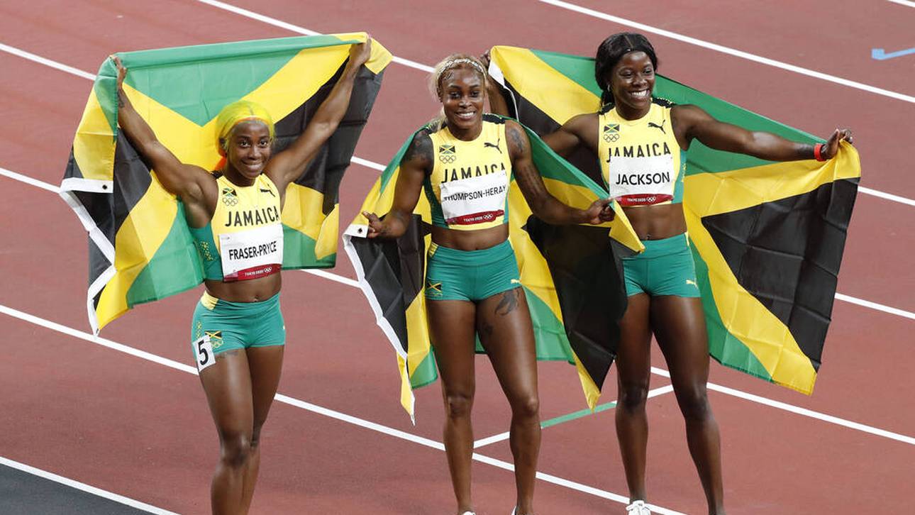 Fraser-Pryce ließ sich danach ebenso wie die neue Olympiasiegerin eine Jamaika-Flagge geben und posierte mit gequält wirkendem Lächeln neben ihrer Konkurrentin, später kam auch Jackson noch dazu. Mit etwas Abstand stellte sich das Trio dann doch noch für die Fotografen auf.