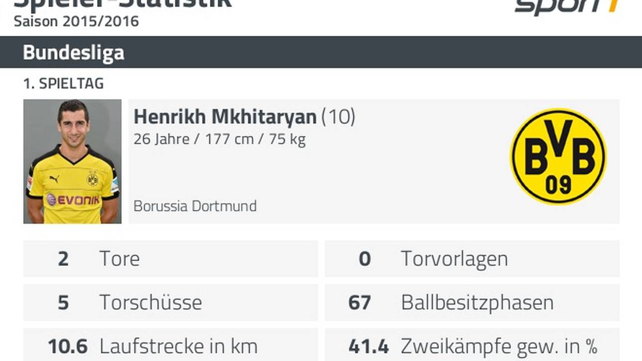 Neben den beiden Bundesligatoren traf Mkhitaryan einmal im Pokal gegen den Chemnitzer FC und dreimal in der Europa-League-Quali gegen den Wolfsberger AC und kommt so auf sechs Pflichtspieltore. In der vergangenen Saison schaffte er insgesamt nur deren fünf (3 Bundesliga, 1 DFB-Pokal, 1 Supercup).