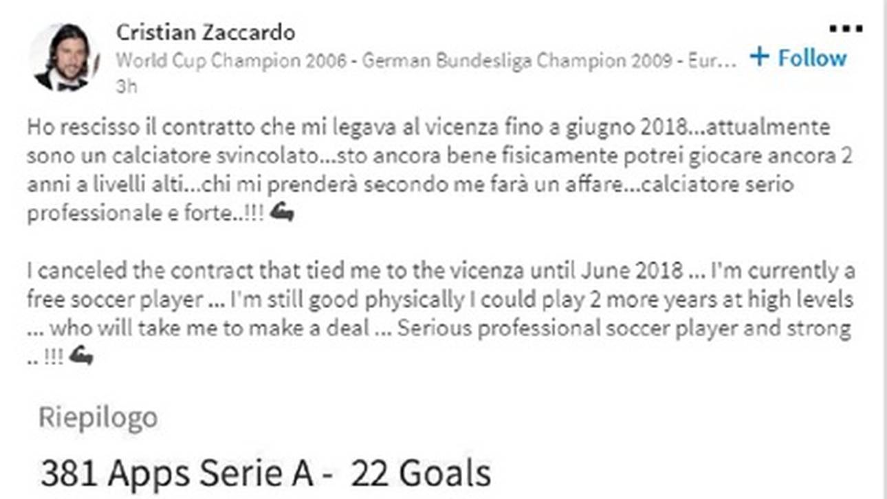 „Nach meiner Vertragsauflösung bei Vicenza bin ich jetzt ein vereinsloser Spieler“, schreibt Zaccardo auf seiner Profilseite und versichert, körperlich noch immer „in guter Verfassung zu sein“, und „zwei Jahre auf hohem Niveau“ spielen zu können.