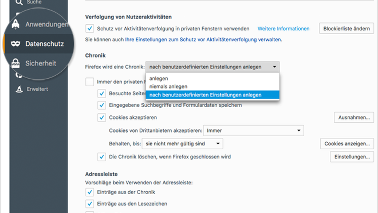 Gehen Sie zum Abschnitt „Datenschutz“ und setzen Sie die Auswahlliste neben „Firefox wird eine Chronik“ auf „nach benutzerdefinierten Einstellungen anlegen“: