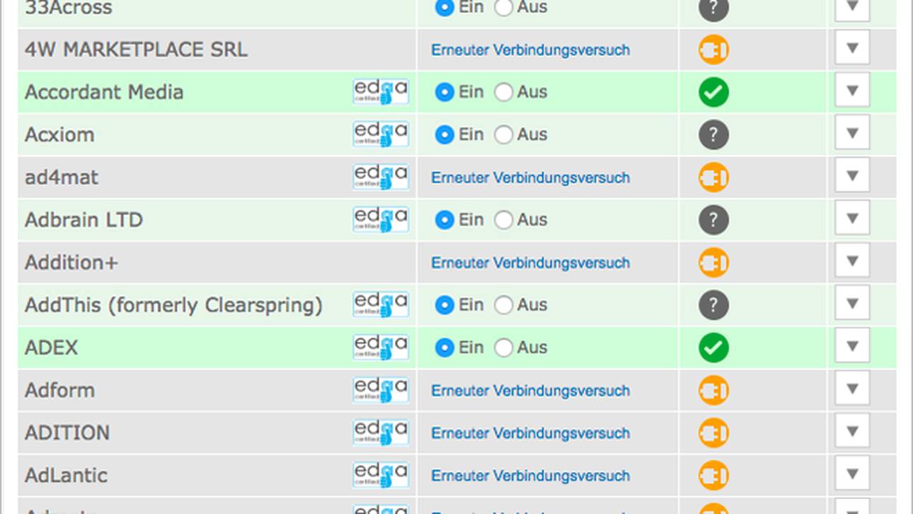 Klicken Sie bei den gewünschten Anbietern in der Übersichtsmaske einfach auf „Aus“.