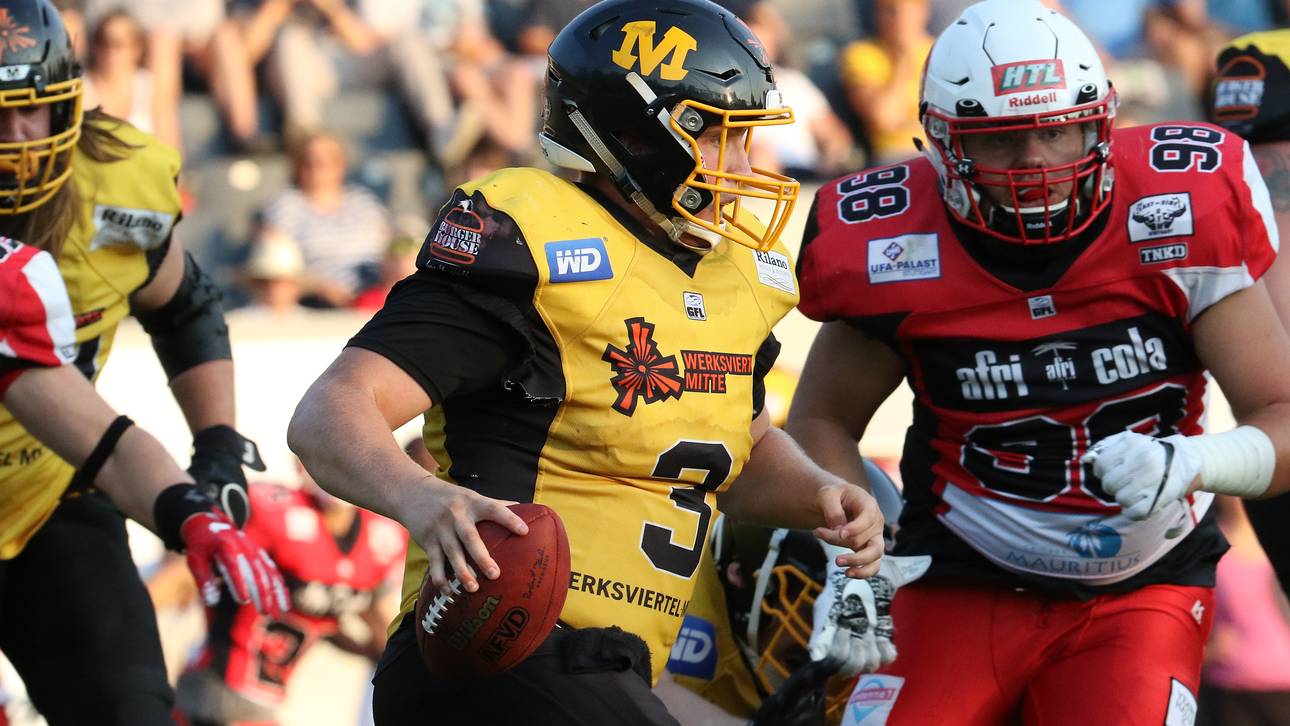 Dass auch solche theoretischen Chancen genutzt werden können, hätten um ein Haar die Marburg Mercenaries in der GFL Süd gegen Samsung Frankfurt Universe bewiesen. Nach einer 7:63-Abfuhr im Hinspiel erwischten die Marburger mit ihrem neuen Quarterback Zac Cunha die Gäste zu Beginn auf dem falschen Fuß und zogen 9:0 in Front.