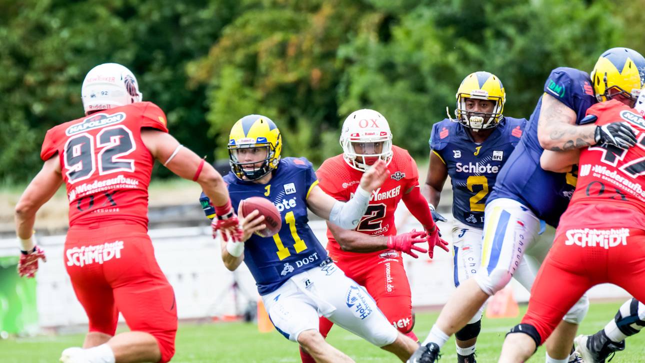 Die Hildesheimer verloren zudem auch noch wichtige Spieler durch Platzverweise oder Verletzungen, unter anderem Quarterback Casey Therriault, der kurz vor der Halbzeitpause mit lädiertem Knöchel ausschied.