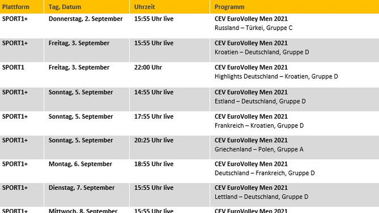 Auf SPORT1+ sind in der Vorrunde weitere internationale Top-Begegnungen der EM zu sehen. Darunter das Spiel Russland gegen die Türkei am Donnerstag, 2. September, live ab 15:55 Uhr und das Match der starken Polen gegen Griechenland am Sonntag, 5. September, live ab 20:25 Uhr.